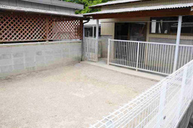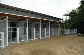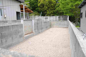 6面に仕切られた砂地の運動場があり、屋内には、ステンレスケージを並べてあります。 悪天候以外は、終日のんびりと過ごせるようにしています。